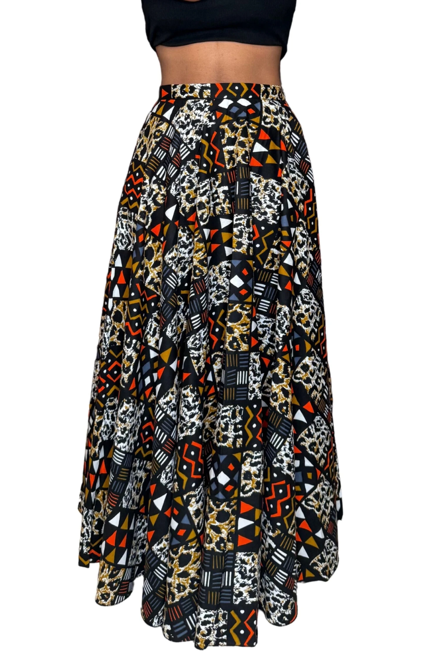 La jupe Tribale Urbaine incarne une féminité affirmée et contemporaine. Son motif patchwork mêle inspirations ethniques et graphismes modernes dans une harmonie audacieuse de noir profond, ocre, blanc, rouge brûlé et imprimés façon animalier. Une pièce forte, pensée pour les femmes qui n’ont pas peur de se démarquer.